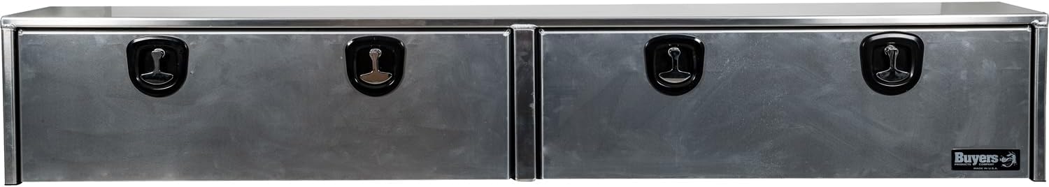 Get dependable, space-saving storage with the Buyers Products Smooth Aluminum Topsider Truck Tool Box. This sleek, low-profile toolbox mounts directly to your truck bed rails, freeing up interior bed space while offering fast access to your gear. Built from .100 in. thick smooth aluminum, the box is both lightweight and strong, with a clean, professional finish. The dual drop-down doors feature beveled edges and watertight continuous hinges, helping to keep out moisture, road debris, and dust. Inside, aircraft-grade cables prevent damage from slamming doors, while the 1/2 in. gasket sealing system adds another layer of protection. For security, the die-cast compression latch system locks tight, deterring theft and keeping your equipment safe during transport. This smooth aluminum topsider tool box comes with J-hooks and side-rail pads for an easy, no-drill installation. It’s an ideal fit for upfitters, contractors, and fleet managers who need professional-grade storage built to last. Proudly Made in the USA for trucks that work as hard as you do.